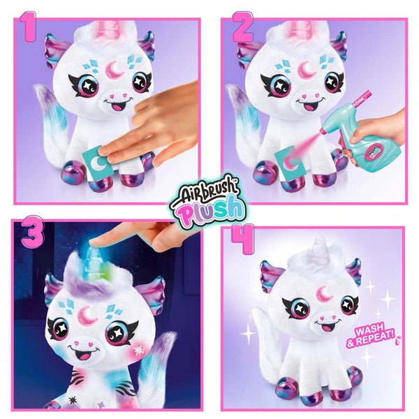 - Contents: 1x Magic Unicorn Plush; 1x Airbrush; 4x Chalk Markers; 120x Stick-On Stencils; 1x Pair of Gloves; 1x Instruction Sheet