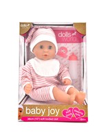 With a soft body that is just perfect for cuddles and hugs,Baby Joy is the perfect first doll for younger children. With baby blue eyes and a beautiful face, this 38cm (15") dolly has a bean filled bum that ensures Baby Joy sits up when required - and when it's time for a nap, the eyes close when you lay your baby down to sleep. The dolly is supplied with a deluxe removeable pink and white striped romper suit and matching hat, plus a bottle and dummy - so everything you need to ensure a delightful role play experience. Age 18m+
