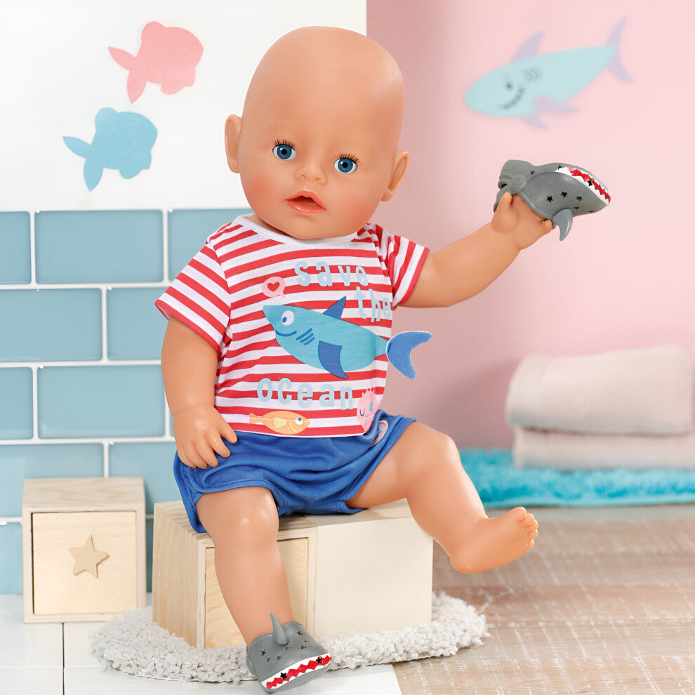 - Once BABY born's had a lovely, warm bath, little ones will love to make their doll baby nice and cosy for a bedtime snooze in these adorable all-in-one pyjamas. With a red and white striped top half featuring a shark graphic, and blue shorts with a shark's face on the bottom, they're sure to bring a smile to little faces. Grey shark slipper shoes complete the look– so cute