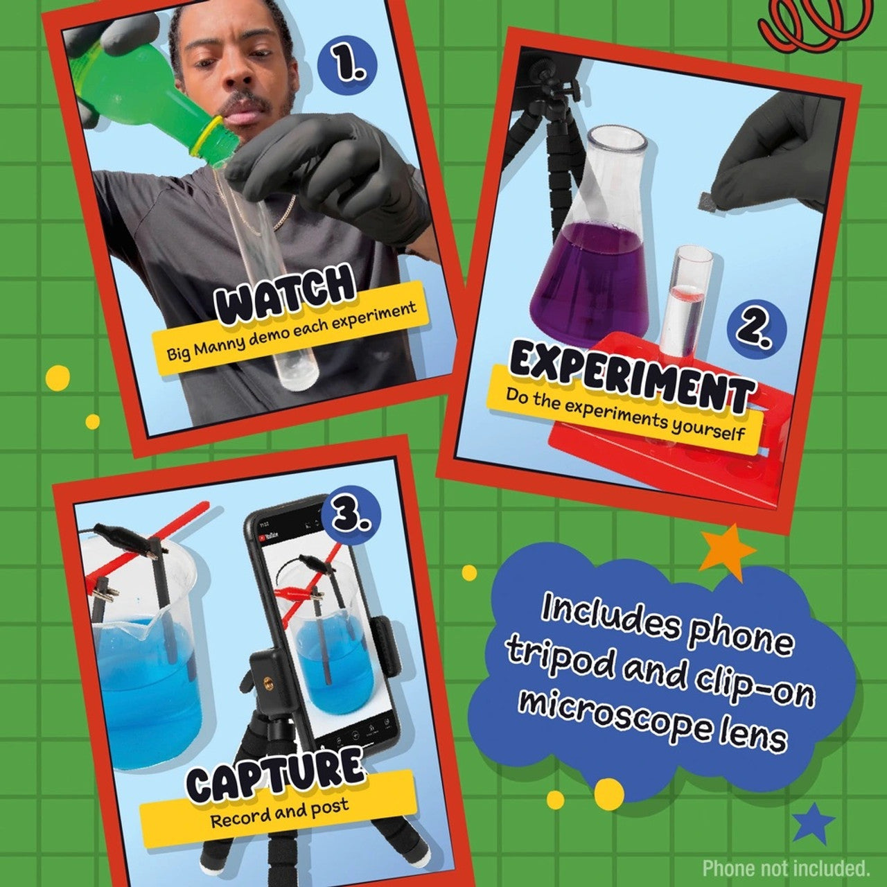 Contents: x1 tripod, x1 test tube rack, test tubes, phone microscope, microscope slides, beakers, flask, battery holder, cooper wire, iron nail, paper clip, ice cube/key ring mould, keyring, x2 graphite rods, x1 scoop, x1 balloon, x1 pipette, x1 spatula