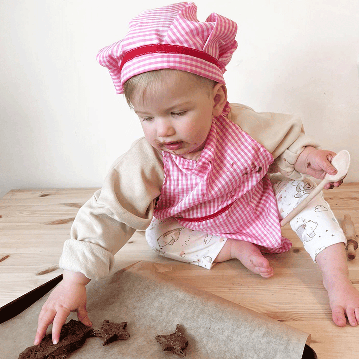 Budding young Chef's need to look the part if they're going to make it to the top. This bright gingham apron with matching hat and oven glove will delight your youngster and encourage an interest in the kitchen and food preparation. This set also includes four pastry cutters and a sturdy wooden rolling pin, to help your youngster to get creative in the play kitchen or even the real kitchen! Encourages creative and imaginative role play. Conforms to current European safety standards. Consists of 8 play pieces.