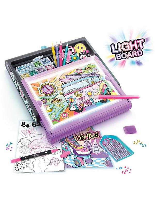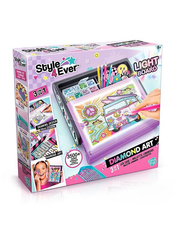 Use the light-up drawing board to draw and trace using the 6 colour pens or creathe diamond stickers.