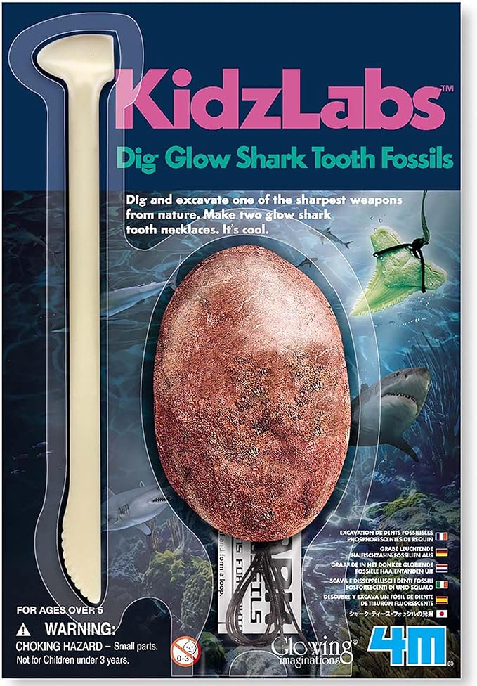 - Contains two glow-in-the-dark shark teeth buried in the plaster block