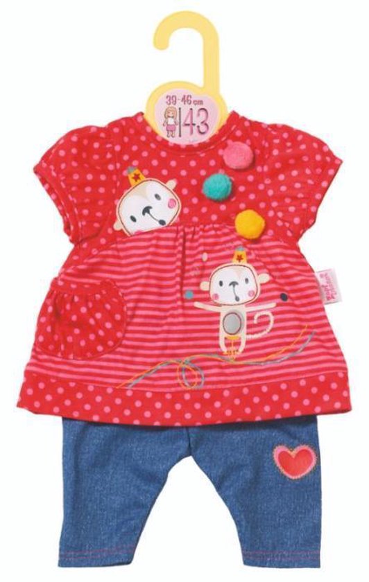 A cheeky monkey style Dolly Moda outfit. The red shirt with cute dots, funny stripes and pockets is decorated with playful monkey applications. The jeans comes with lovely heart shaped patches on the knees.