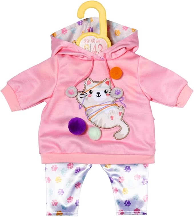 Doll clothes 43 cm: the cute kitten on the pink hoodie plays cheerfully with wool balls; the ribbed cuffs look like the finest knitwear; the doll outfit is suitable for children aged 3 and overWith detailed design: the kitty has already left its mark on the grey trousers. Colourful paw prints are printed thereFor 39-46 cm dolls: thanks to the casual cut, Baby Born, Baby Annabell and other dolls in a size of 39-46 cm can cheerfully swap clothes back and forthQuality promise: the item is an original branded product from Zapf Creation; it is manufactured to a high quality and guarantees long-lasting funBox contents: Dolly Moda jumper and leggings 43 cm
