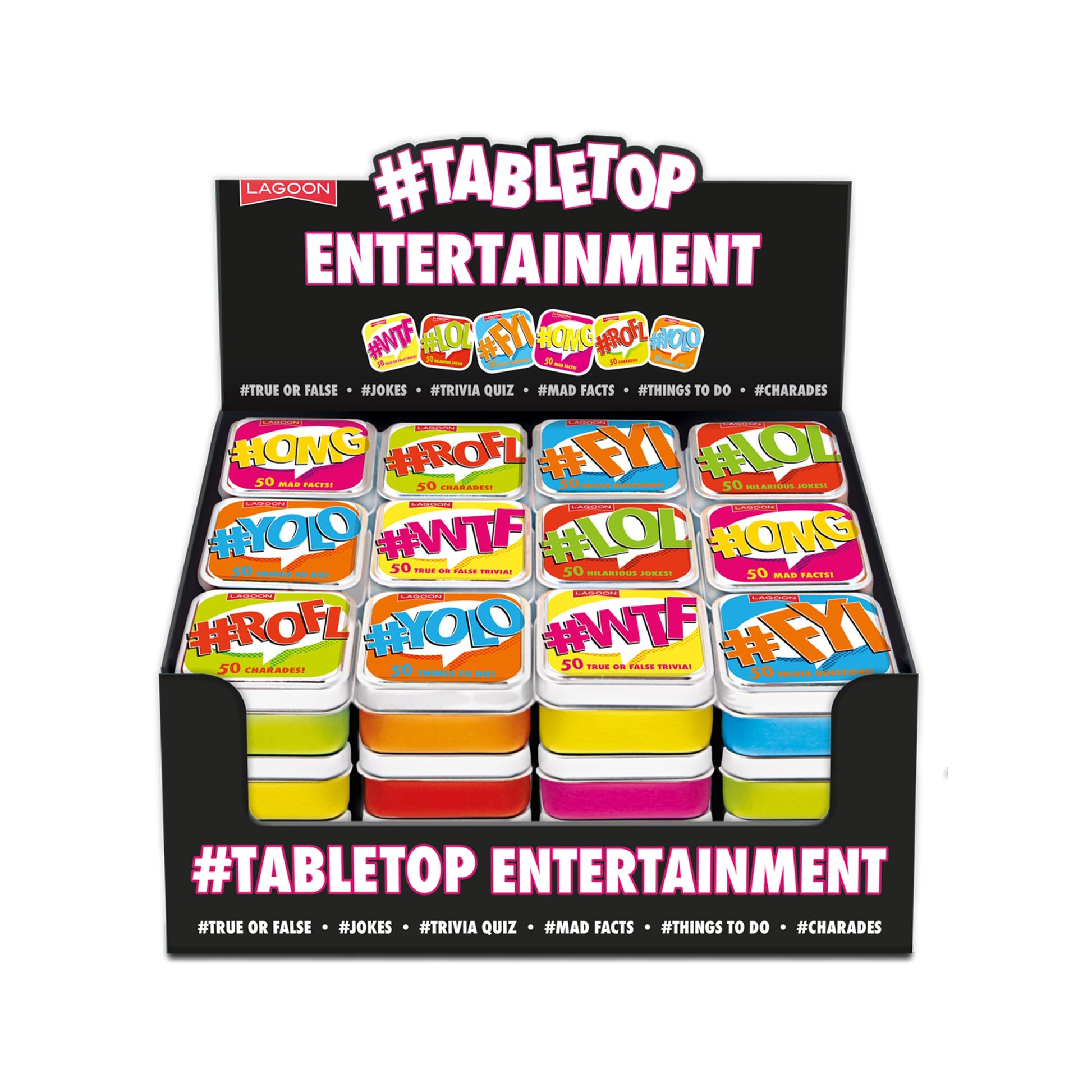 Another great new addition to Lagoon's tabletop range, a fun collection of jokes, trivia, games and facts all related to social media. A tremendous gift for tricky-to-buy-for teenages. Titles include: #OMG Mad Facts, #YOLO Things To Do, #ROFL Charades, #WTF True or False Trivia, #LOL Hilarious Jokes and #FYI Trivia Questions.