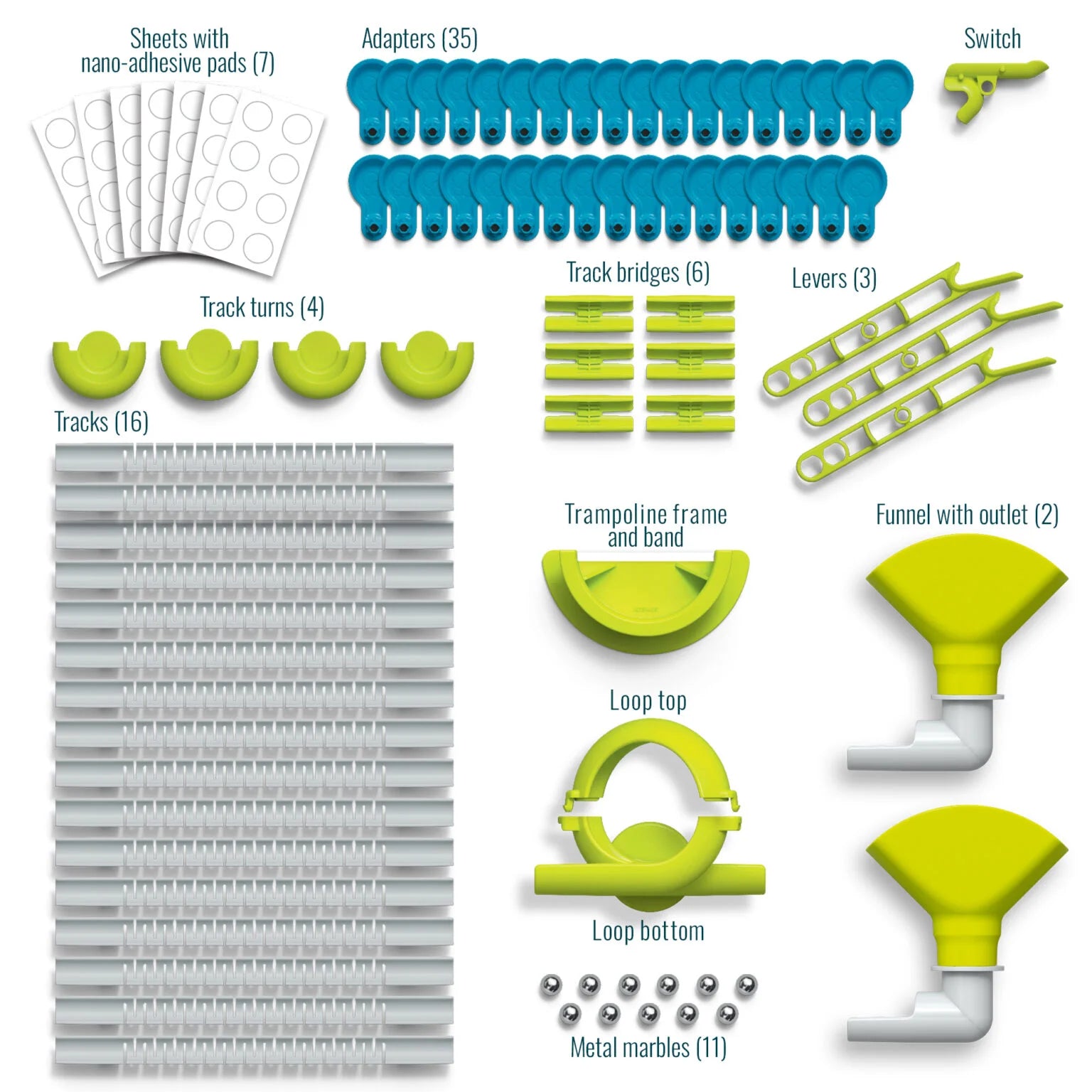 Gecko Run deluxe takes classic marble runs to the next level with new creative challenges and less restrictive building requirements. This innovative marble run uses a specially designed system of flexible tracks that does not require any support structures. Traditional marble runs require lots of pieces to create vertical height, but with Gecko Run, your doors, windows, cupboards, bookcases – virtually any smooth surface – become part of your track, allowing you to build higher with fewer pieces.