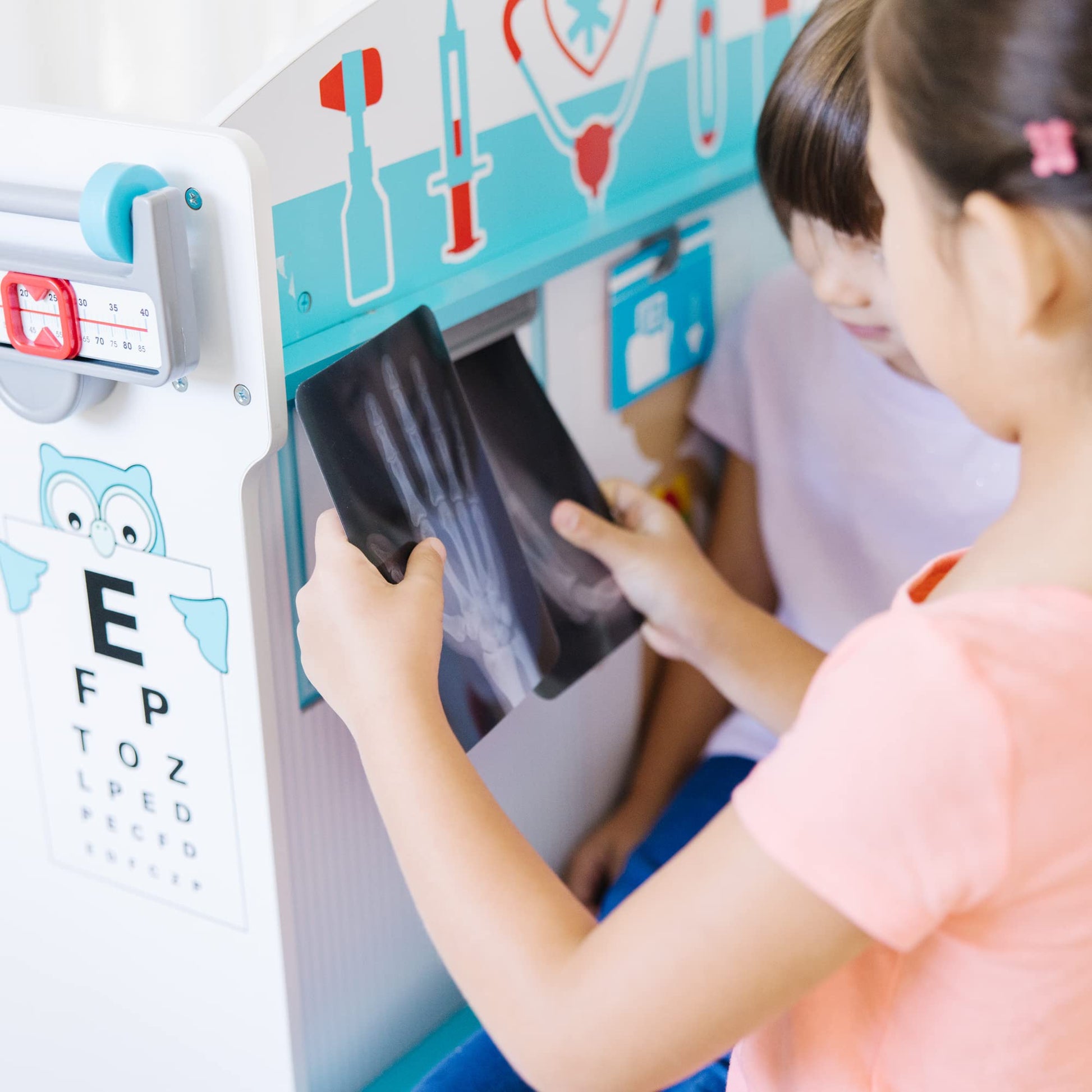 - Includes blood pressure monitor with adjustable cuff, 2 X-rays to display, scale with movable weight, adjustable height bar, eye chart, clock with movable hands, movable tool hooks and holders, sink, sanitizer pump, reversible diploma/window card