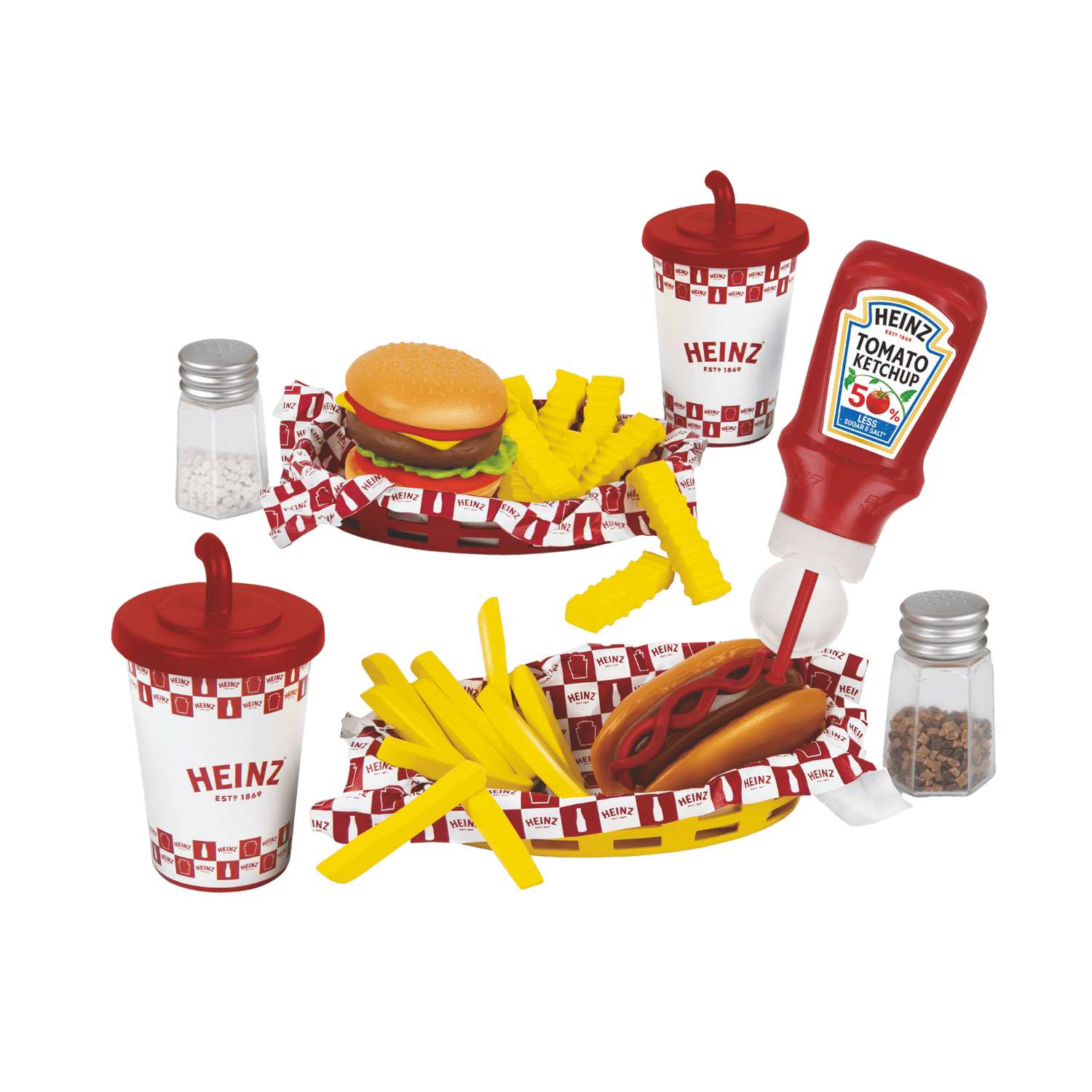 heinz tomato ketchup, burger and filling play food, hot dog and sauce topping, fries, crinkle-cut chips, 2 x food baskets with linings, 2 x soda cups, salt shaker, and pepper shaker. -