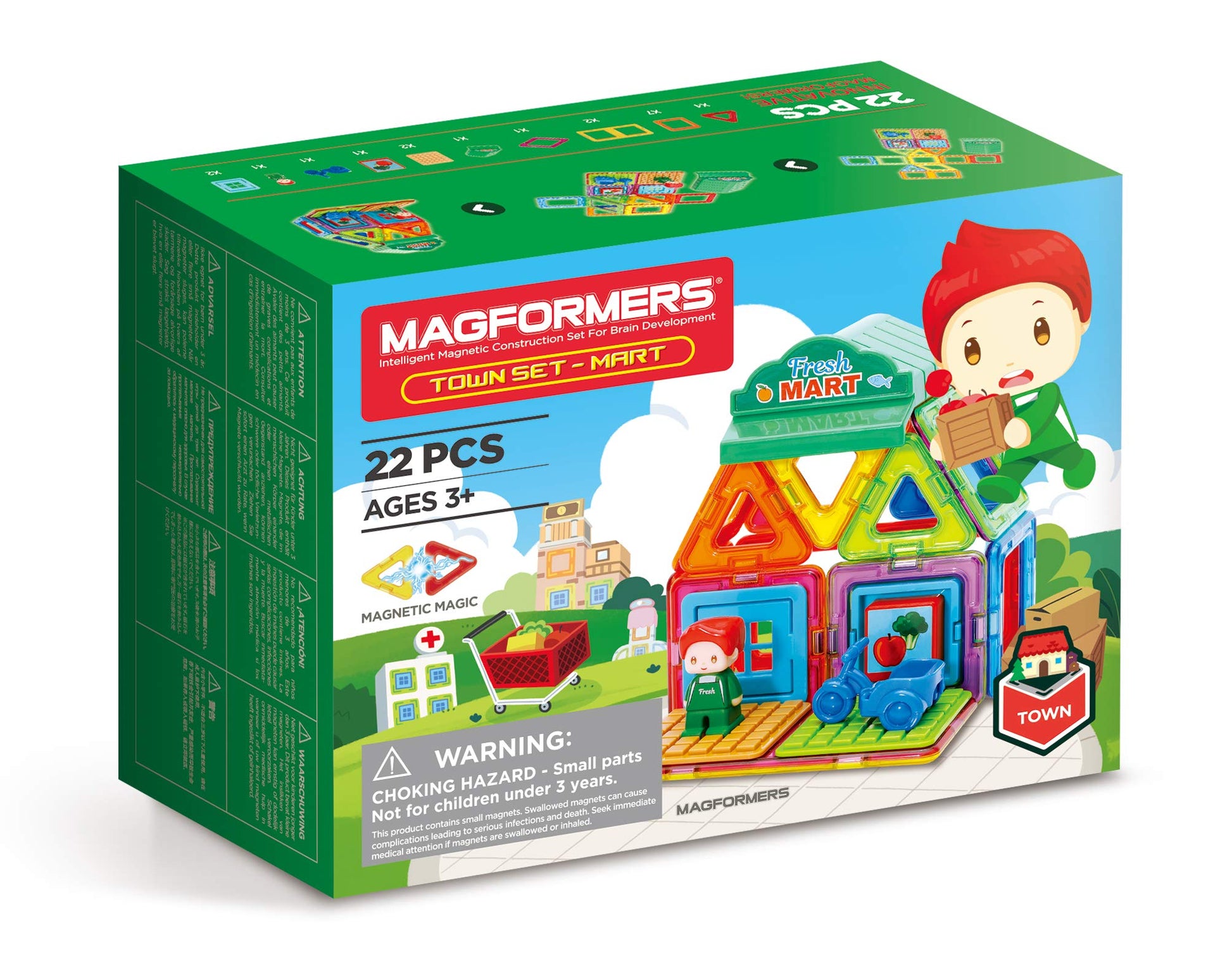 - In this super 22-piece magnetic construction toy set youâÃôll find 14 Magformers magnetic shapes, seven supermarket-styled accessory pieces plus a shopkeeper.