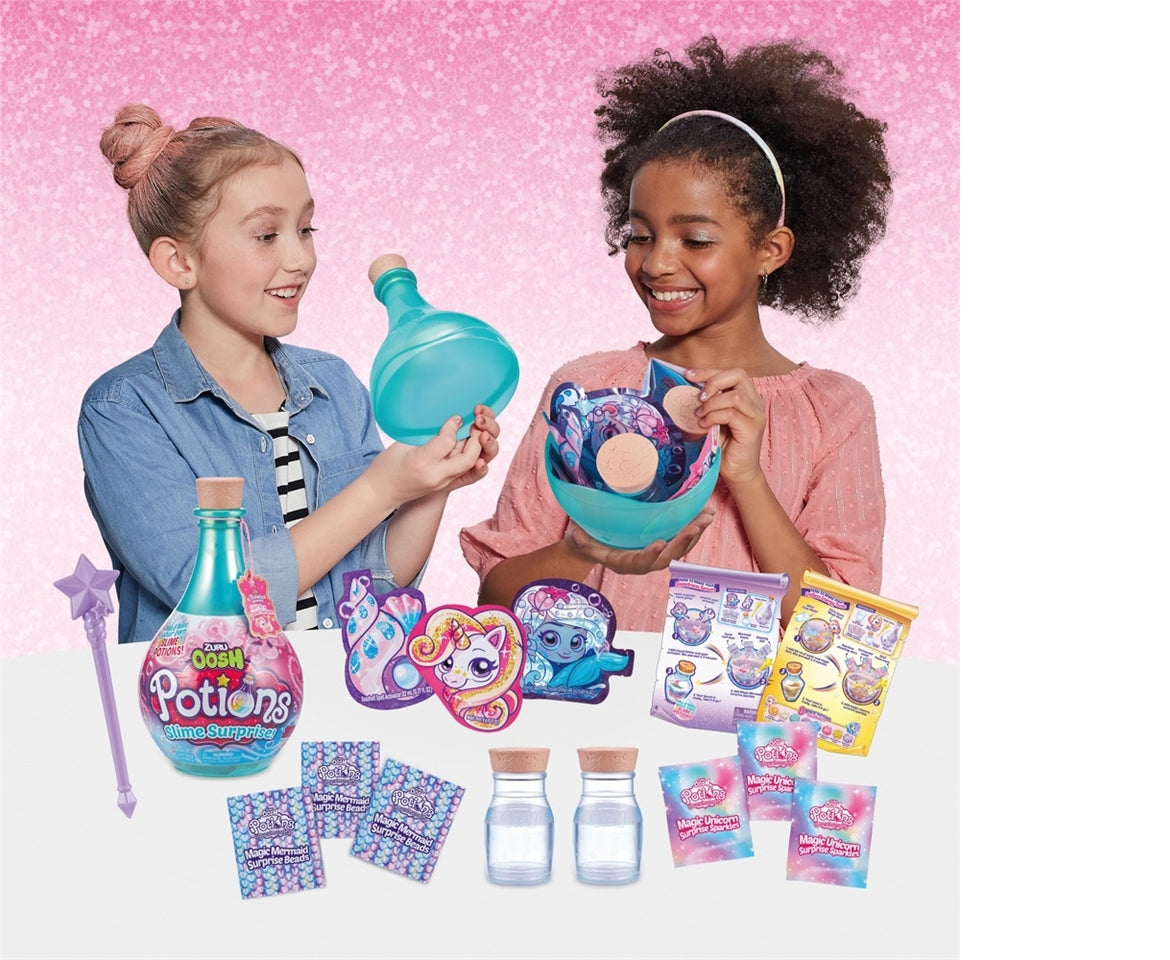 There's so much magic to find with this Zuru Oosh Potions Slime Surprise Assortment! New Potions Slime Surprise from ZURU OOSH adds a dash of magic to DIY slime-making. There are 4 different magic potion bottles, each with two surprise potions to create inside – from the BFF's Elixir to the Enchanting Potion, each sold separately. How to Make Slime Just pop open the sparkly Potion bottle and use the base as a bowl to make each potion with the included glow-in-the-dark mixing wand. Every spell-binding potion comes with its own gooey or powder base, three different accessories to add, storage bottles and an easy-to-follow magic slime recipe!