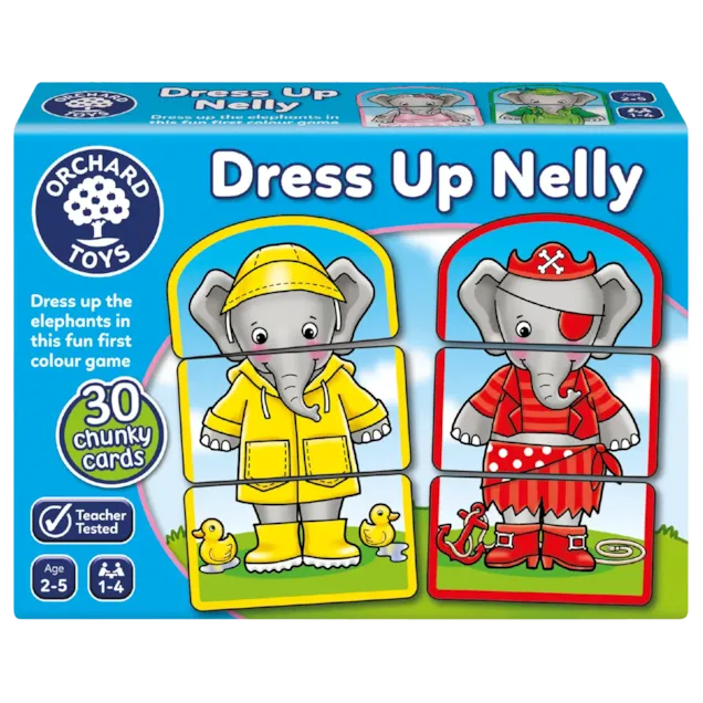 Use the friendly elephants to learn about colours as you dress them in their different outfits! Dress Up Nelly can be played as a fun and simple activity to introduce children to colours, by placing all the cards face up and matching or mis-matching their head, body and legs.