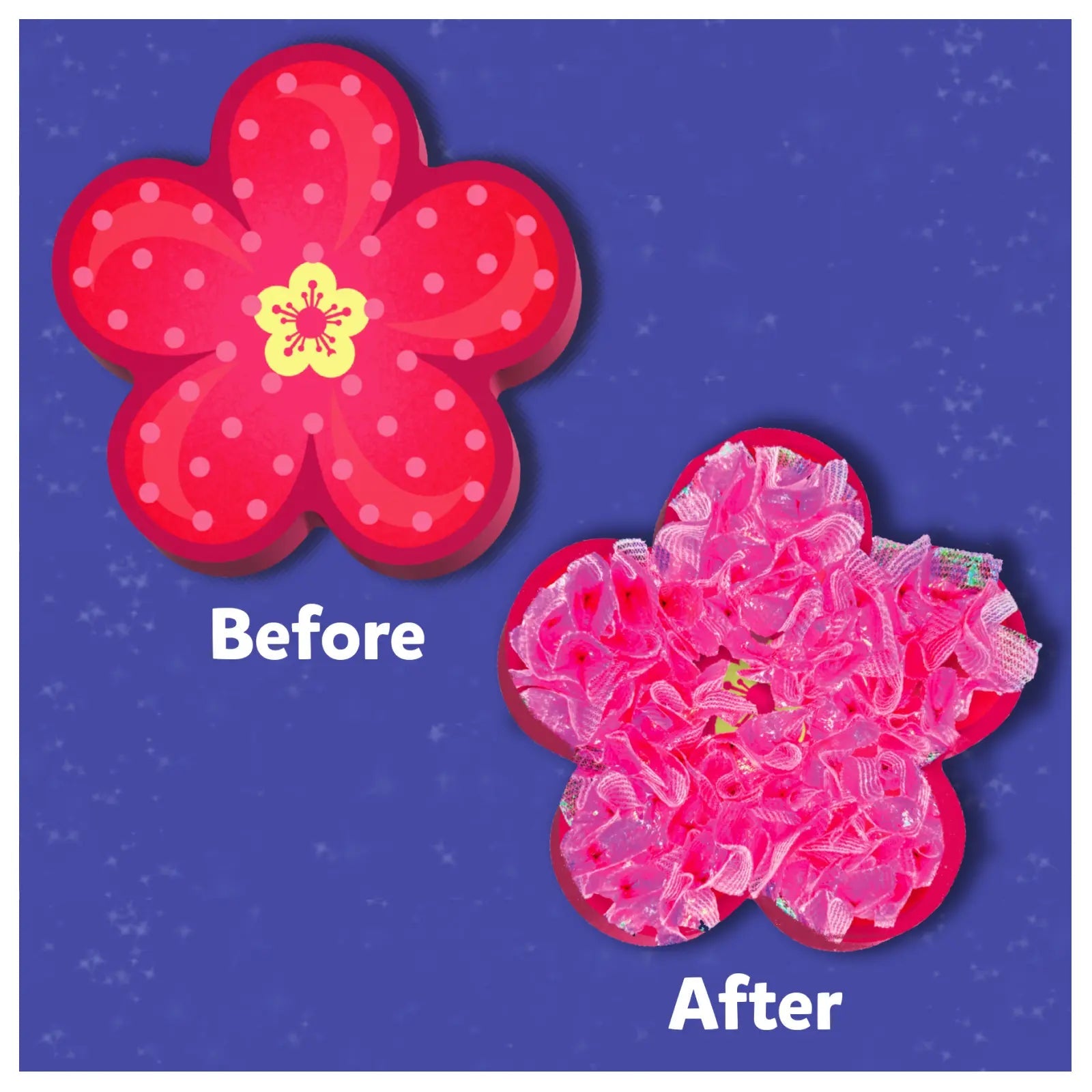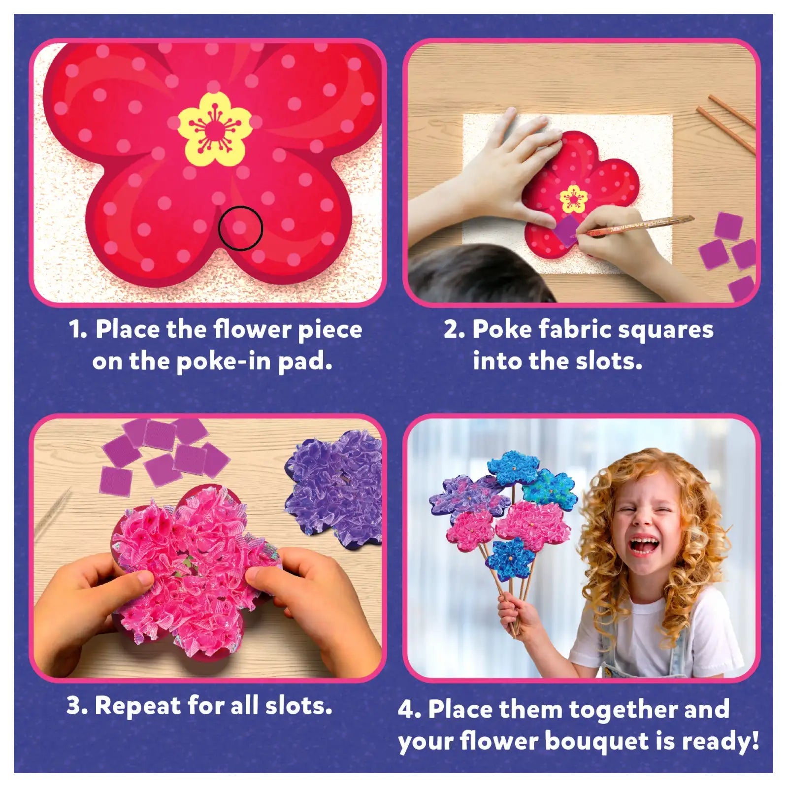 This mess-free craft activity encourages creativity! Kids will make their own flower designs using fabric squares that are poked into foam to create petals and then mounted on wooden stems. Once complete, these beautiful DIY flowers can be arranged into a lovely bouquet