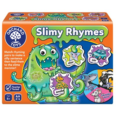 Players start with a selection of five green slime cards. Taking it‰ in turns they choose a purple slime card - if the card rhymes with one of the cards in front of them, the player must think of a silly sentence using the two words. Once they have a rhyming sentence they spin the spinner to find out in what style they must say their silly sentence in: whilst either holding their nose, with their teeth together, or in a squeaky voice!