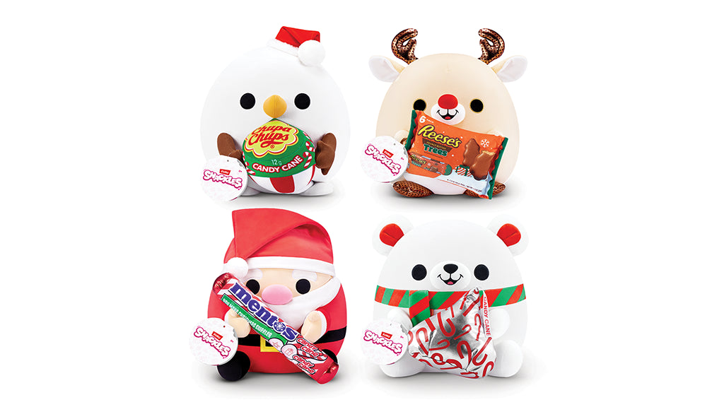 This Christmas-themed plush collection includes a reindeer, a snowman, a bear, and Santa, each cuddling a licensed holiday snack.