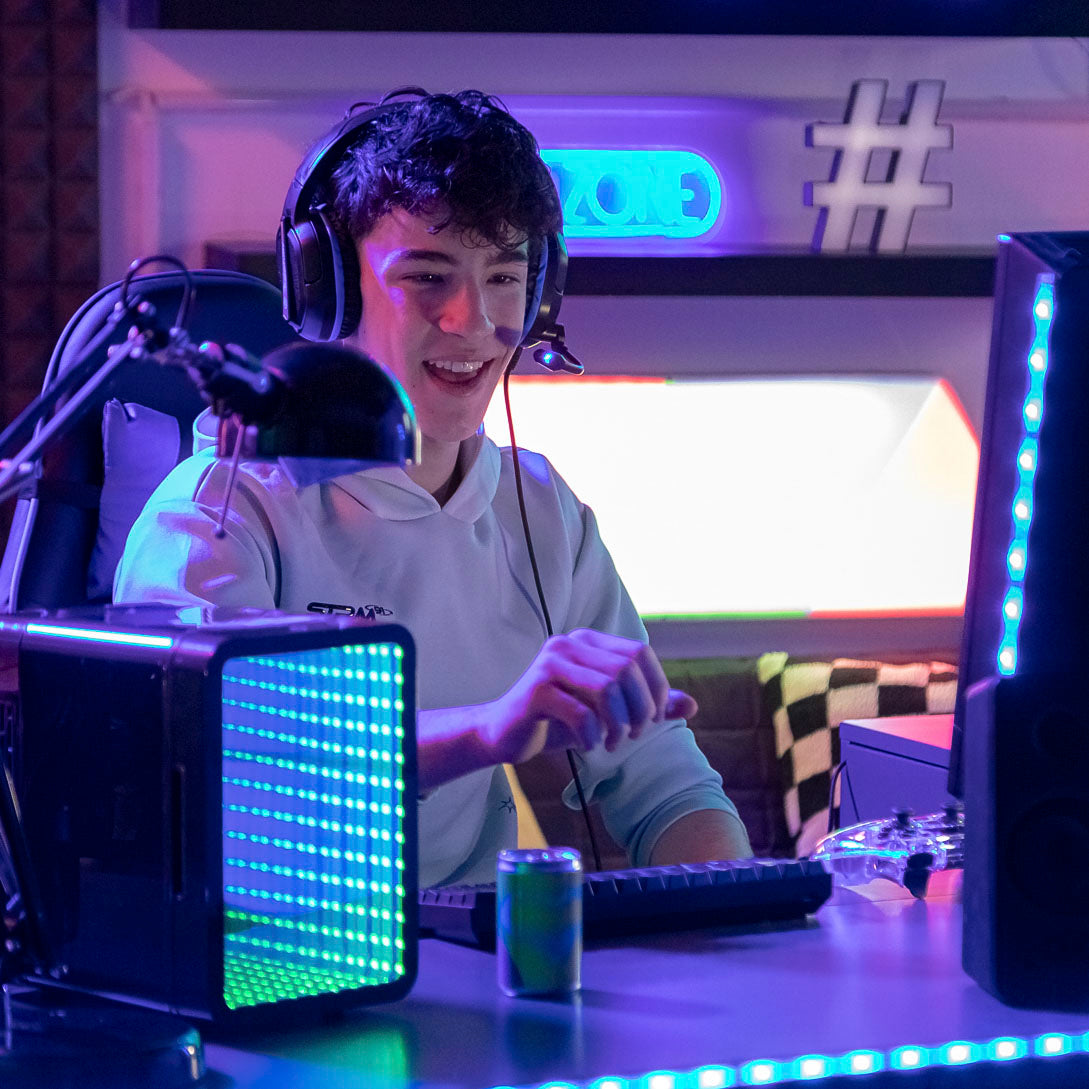 The ultimate accessory for gamers, tweens and teens. This cool mini fridge will keep your essentials perfectly chilled at home or on the go. Featuring a unique infinity light effect door that doubles up as a mirror.