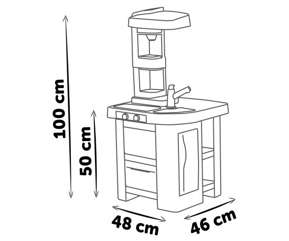The Tefal Studio kitchen from Smoby combines imaginative role play with realistic functions. Playable all around, the children's kitchen offers little gourmets extra space for cooking and baking. The Tefal Studio has a stove with ceramic hob and extractor hood, an oven and a refrigerator. There's also a sink with a faucet and plenty of storage compartments for stashing dishes and play food. The magic accessories are also great: meat and fish have two different sides - raw and fried. And the magic pasta is ready too. An electronic sound module in the stove top provides realistic cooking sounds. The soda machine with sound and an espresso machine with tabs round out the kitchen equipment. Includes 27 accessories.