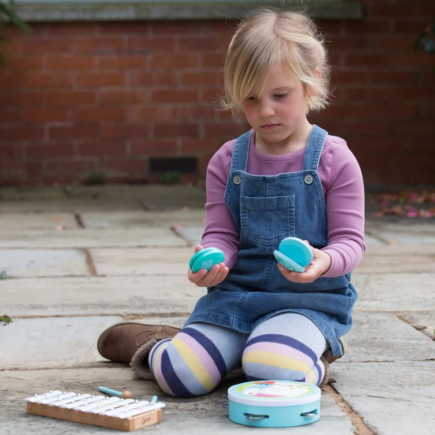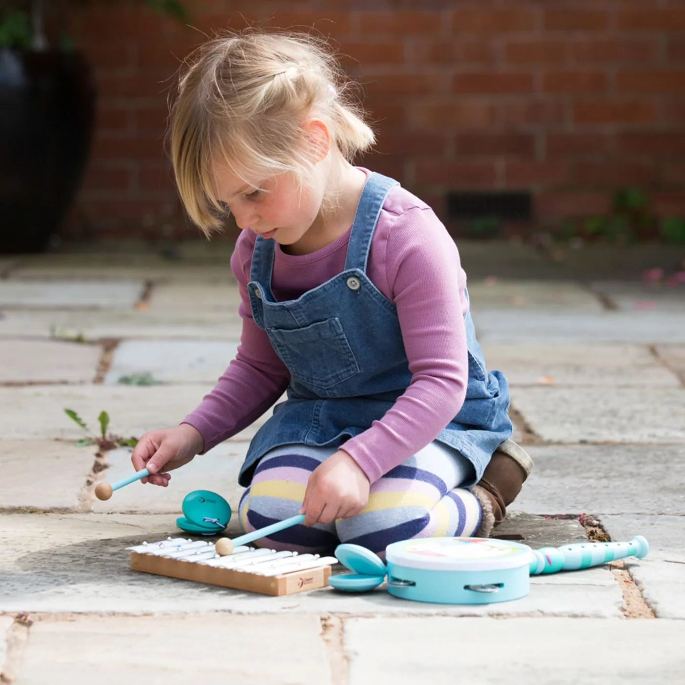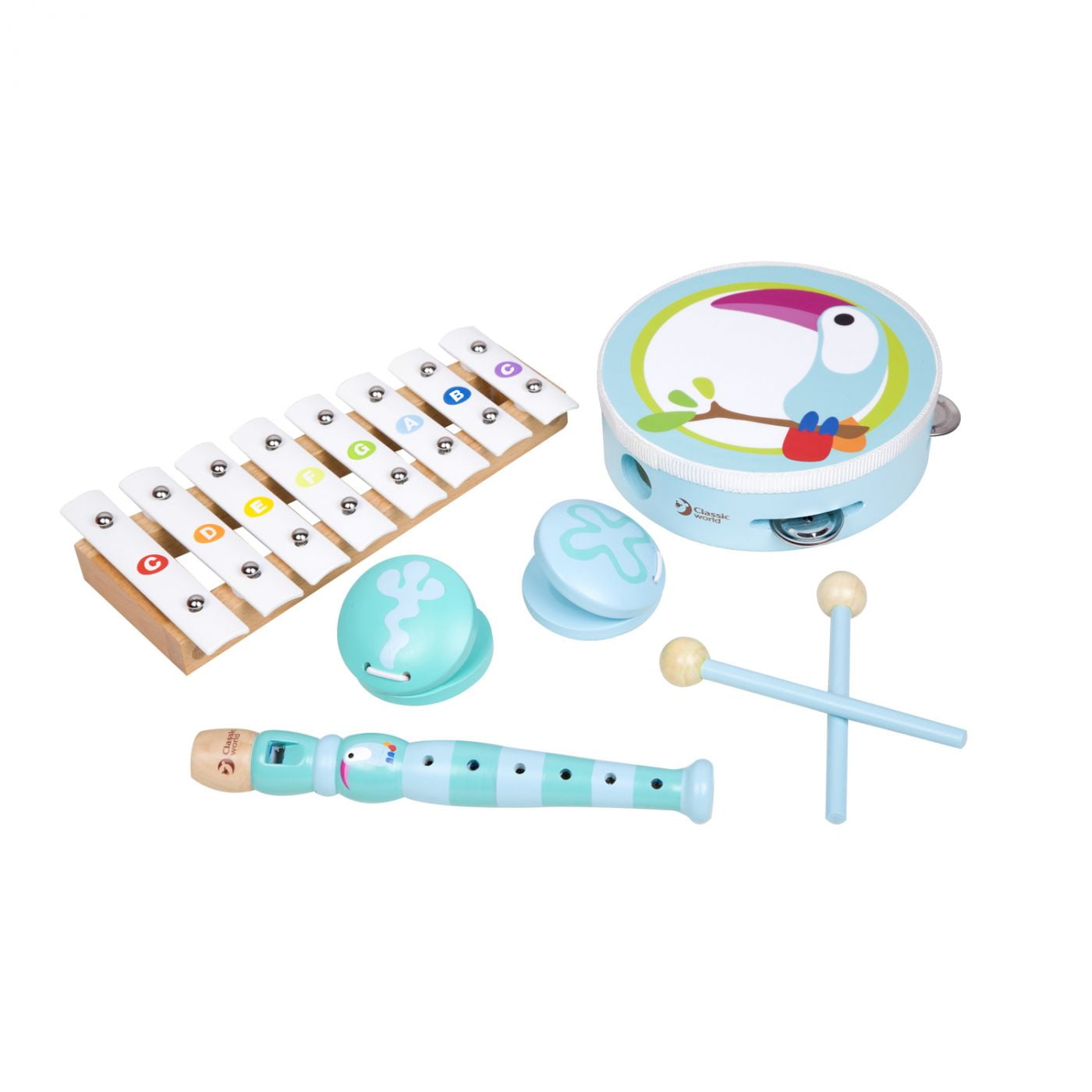 - Set includes: xylophone, flute, tambourine and castanets