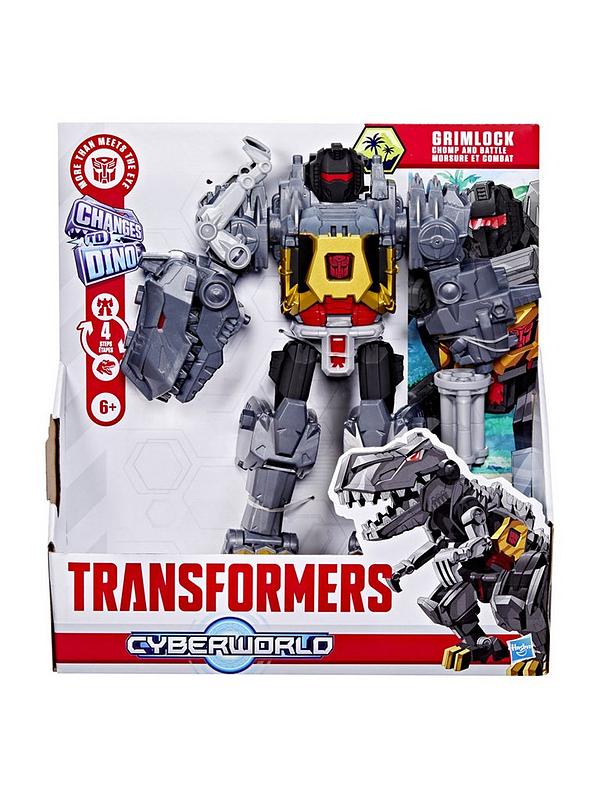 In Transformers CYBERWORLD, children decide what happens and it starts with amazing toys like Grimlock Chomp & Battle figure! This 22.5-cm (9 inch) Grimlock toy changes from robot to dino in just four steps that are simple enough for children ages 6+. In robot mode, this toy features a spinning blaster arm, chomping dino arm & a chest panel that opens into a mech suit for Cyber Changers figures (each sold separately, subject to availability). In dino mode, the toy has a chomping dino head, spinning blaster tail, & the Cyber Changers figures can ride on his back! Give childrens storytelling power a boost with additional CYBERWORLD toys (each sold separately, subject to availability), and discover unique characters, alt modes, environments and more. Fans of Transformers collectibles & newcomers alike will love discovering this take on the Transformers universe, where the only constant is change.TRANSFORMERS and HASBRO and all related trademarks and logos are trademarks of Hasbro, Inc.