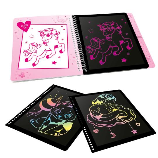 A magical colour spectacle: In the Magic Scratch by Ylvi and the Minimoomis, a colourful world full of unicorns and other cute creatures is created step by step on the black pages with every stroke of the accompanying scratch pen. 20 pages, with spiral binding.